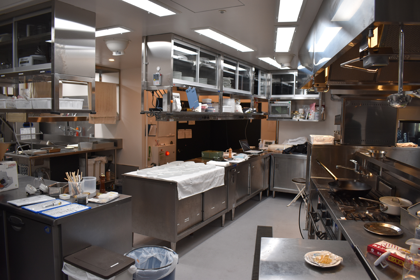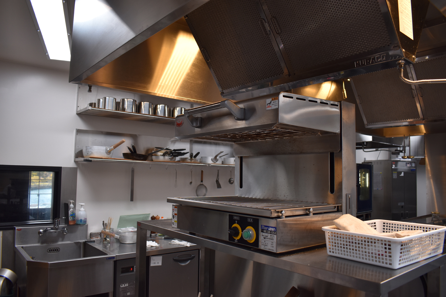 また、グリドル(フライトップレンジ)やサラマンダーはメインダイニングに面した窓の近くに設置している。