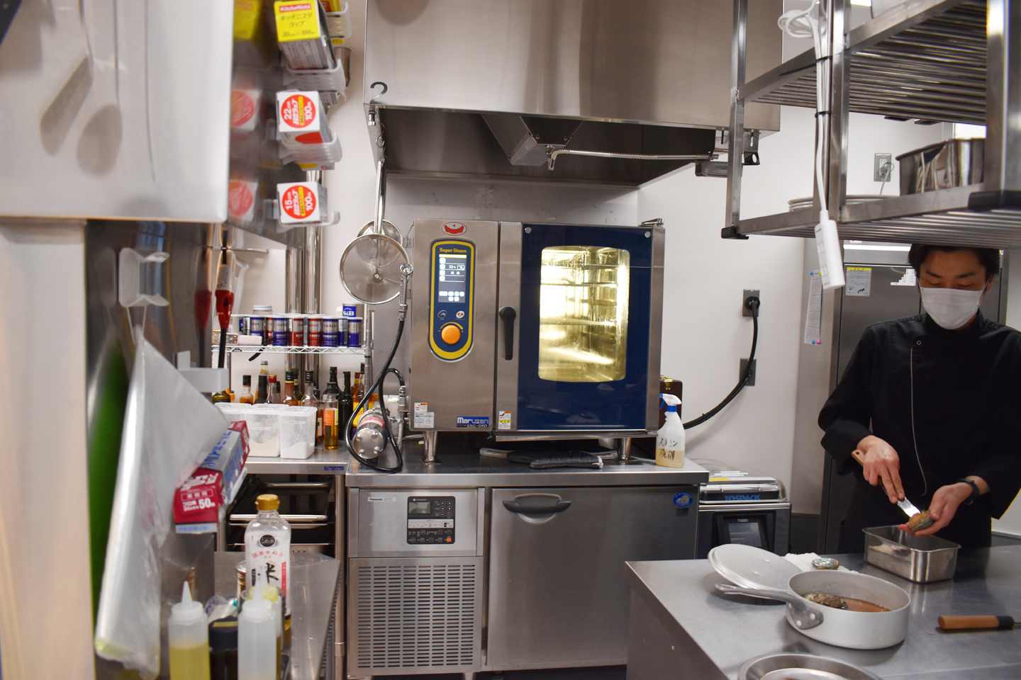 「スチコンの用途は色々です。100℃で蒸すこともあれば、中温で火を通すこともありますし、真空調理の加熱にも使っています。芯温センサーはローストビーフの調理に使用しますし、メニュー機能も重宝してます」