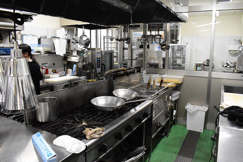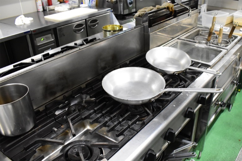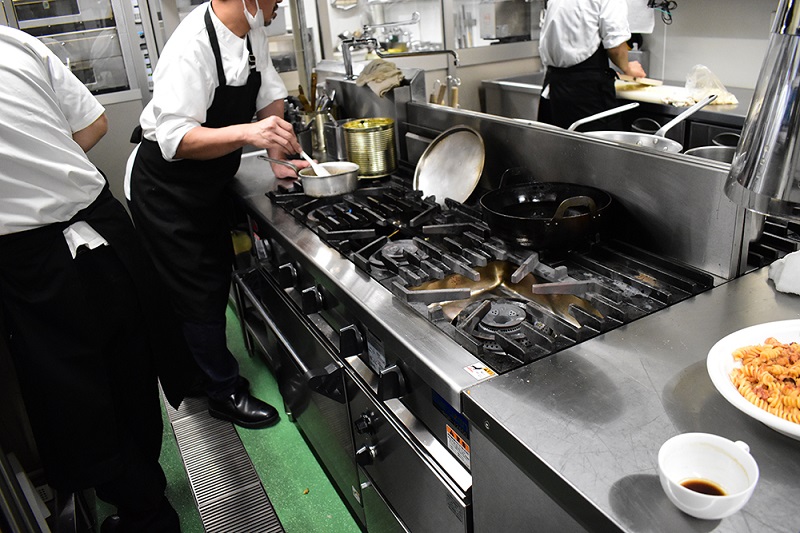 「ガスレンジとガステーブルを向かい合わせることで、お互いがお互いの手元を見ることができる。それが良い勉強になるんです。それにお互いの作業内容を普段から見ていれば、いざ忙しいときにお互いがフォローし合えるんです」