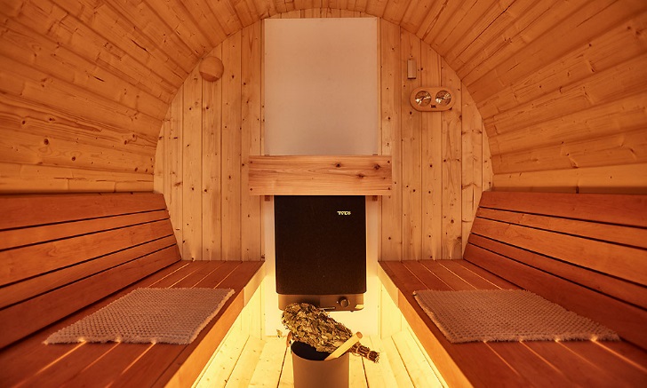 「はなれ橘」「amane」に導入されているエストニア製のバレルサウナ。部屋付きなのでゆっくりとサウナを楽しむことができる。