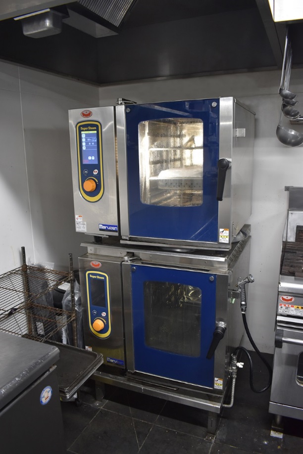 それではいよいよ厨房にお邪魔させていただく。今回は数ある同グループの施設の中から「さざね」と「amane」の厨房に案内していただいたのだが、どちらの厨房でも当社製のスチームコンベクションオーブンが2段組で使われていた。
