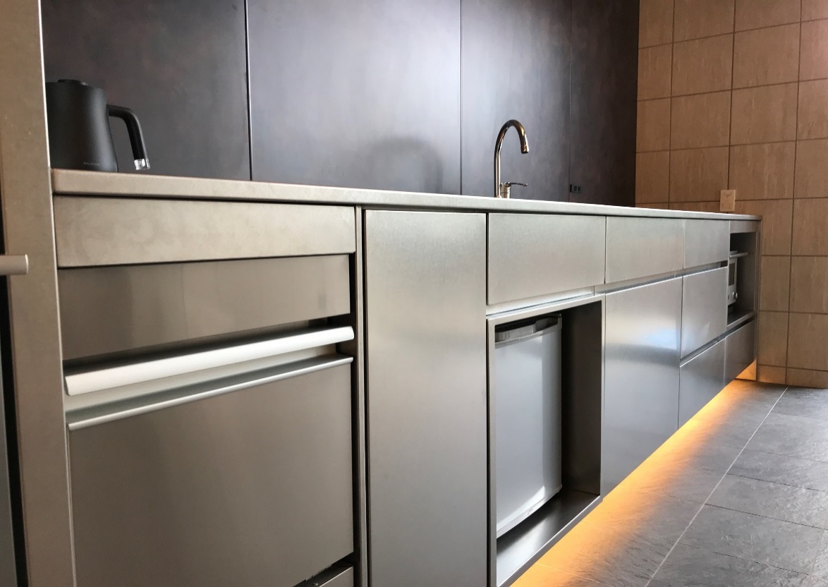 続いて「amane」の客室に案内していただいた。先述したとおり、ここ「amane」は敢えて半調理したものを提供し、お客様自身が最後の仕上げをすることで食事時間を自由に調整できるのが特長の一つになっている。当然客室にキッチンが必要となるため、当社にて製作させていただいたのがこちらのプライベートキッチンである。