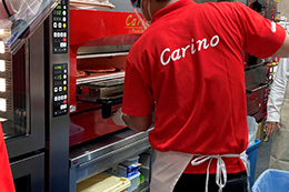 電気ピッツァ窯カリノを用いての実演も行いました。扉ガラス、ecoモード、蓄熱性等カリノの魅力的な機能についてご説明。試食も定番のマルゲリータとマリナーラを豊富にご提供。