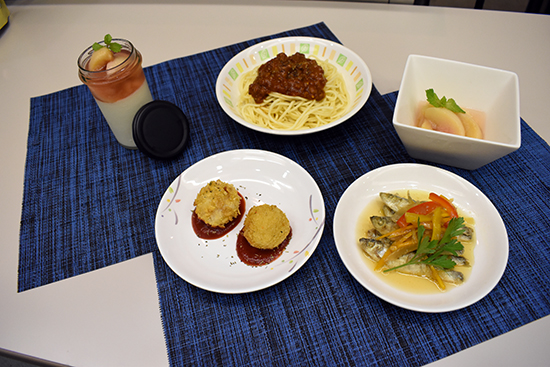 今回のスチコン講習会の調理実演は@ミルクプリン、Aミートソーススパゲティ、Bライスボールコロッケ、C桃のコンポート、Dいわしのエスカベッシュをご紹介致しました。