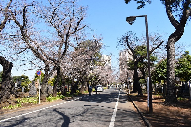前回に比べると開花は進んでいるようですが、見頃にはまだまだ遠く、咲き始めといった感じですね。それでも本日の陽気も手伝ってか、咲き始めの桜を見物に来られた方たちや、保育士さんに連れられて近所の保育園の園児たちが遊びに来ていたりと、穏やかかつ賑やかな平和な時間が流れておりました。 さて、大通りの桜はまだまだ咲き始めではありましたが、霊園の中ほどに進んでいきますと中には一足早く開花している桜もありました。