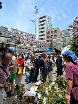訪れた日は気温も30℃を超える真夏日という天候でしたが、会場内に到着すると、出店が立ち並ぶ言問通りには、朝顔の植木鉢を持ったお客さんで賑わいを見せておりました。