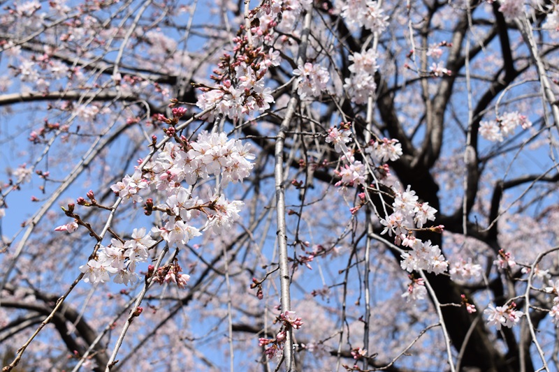 先週時点では蕾が赤くほころびを見せる程の様子であった境内の枝垂れ桜は八分咲き。