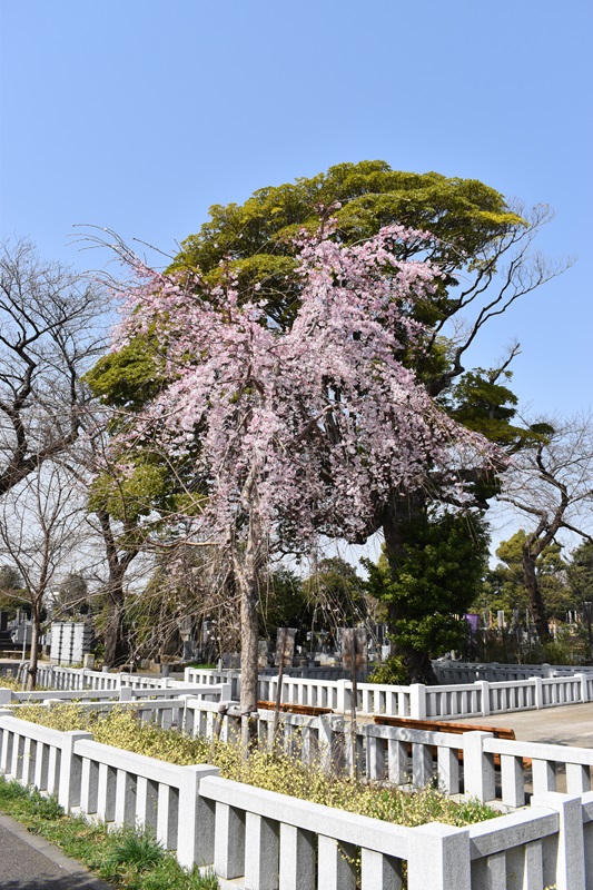 また、霊園南側の枝垂れ桜は、春初の陽光に照らされて薄紅に彩られておりました。