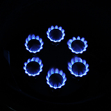 高温集中加熱で鍋中心より力強く熱する高効率なバーナーです。中心に強火力が集中するためイタメ調理に最適。広東料理や大鍋での大量調理に適しています。また、炎を小さく絞るとろ火調理にも適しています。