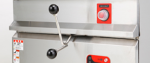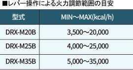 20,000kcal/hタイプは最小で3,500kcal/hでの燃焼が可能。強火力での炒め調理から少量の煮込み調理まで幅広い調理に対応できます。また火力調整はレバー操作で簡単です。