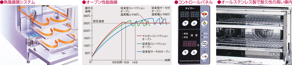 - 大型パンをらくらく収納できるひろびろ設計のオーブン。庫内温度を100~350℃まで自由に設定でき、調理のマニュアル化がはかれます。
