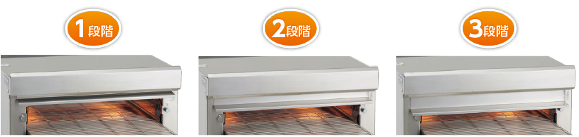 コンベア開口部のシャッターはメニューに応じて高さを変えられます。無駄な放熱を防ぎ省エネです。