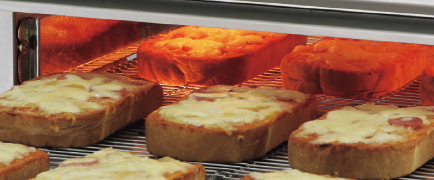 コンベアの速度とヒーター出力は調整が可能なため、食パンはもちろん、クロワッサン、ベーグル、ハンバーガーのバンズなど、様々なパンをトーストできます。また、ピザパンなどのパンに具材をトッピングしたメニューにも対応できます。![]() |