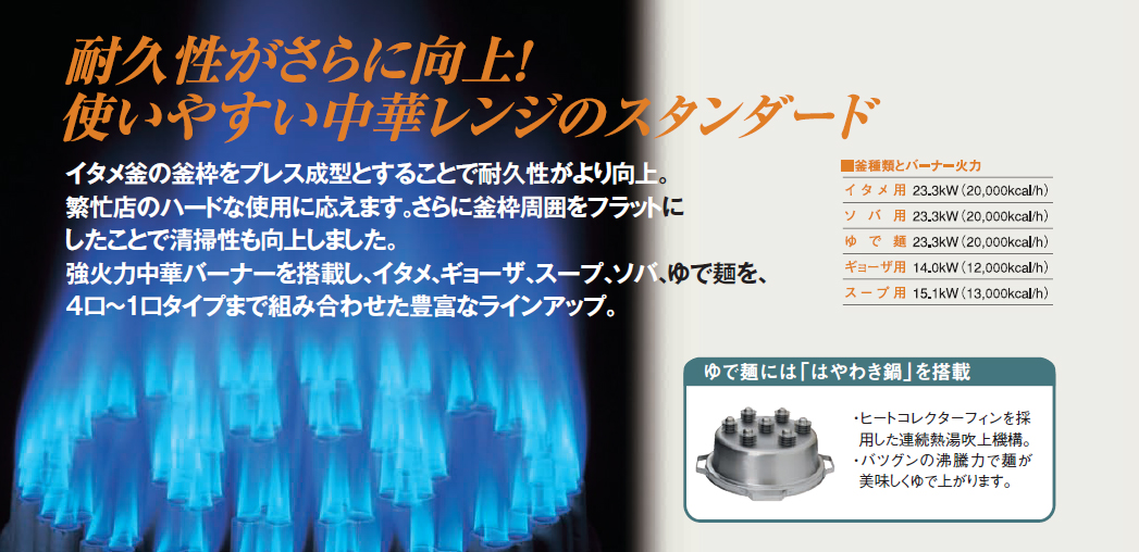 ◆ゆで麺は「はやわき」用鍋・カゴ組み込み。※全機種バックは一体式ですが分割式も承ります。また、棚は平棚固定タイプですが、平棚なしタイプ・取り外しタイプも承ります。