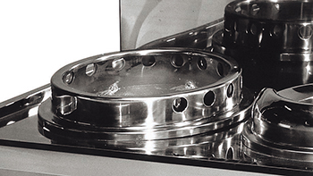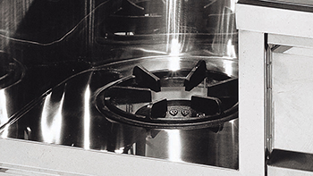 SUS304ステンレス特殊絞りの釜枠に、多くの排気孔を設けました。これにより炎が平均して回り、加えて3ヵ所のビスにより鍋の水平調整が可能で、均等に焼き上がります。バーナーはギョーザ用に設計したファイヤースクリーンバーナーを採用しました。