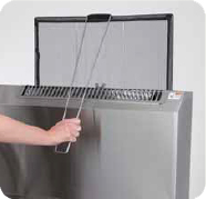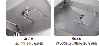 冷却室のカゴ受け、ノズルは工具なしで簡単に取り外して洗うことができます。カゴ受けとノズルを外した冷却室は凹凸の少ない構造となっており、非常に清掃性に優れています。