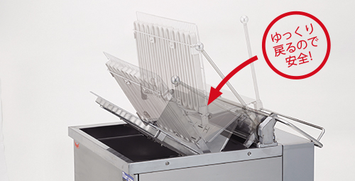 スイングアップしたヒーターを戻す際にダンパーが働くため、手を離しても急激に落下せずゆっくりと下降します。ヒーターが油面に落下することによる火傷の心配がなく安全です。さらにスイングアップしたヒーターは自動で通電が停止するため、手を触れてしまって火傷をする危険性が大幅に減少。清掃時の安全性が大幅に向上しました。