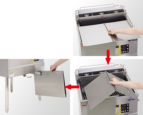 油槽のフタは折りたたみ式とし、本体下部に収納できる仕様としました。かさばるフタの置き場所に頭を悩ませることはありません。