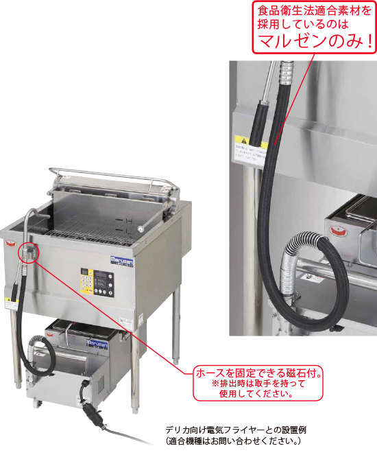 排出ホースには食品衛生法に合格済みの素材を採用。耐油性、耐熱性に優れ安心です。