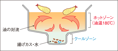 油槽底面より熱対流が発生することで油が均一にムラなく加熱。さらに揚げ力スや水分がクールゾーンに落下するので、酸化を抑えて油の寿命を長持ちさせ、油代を節減します。