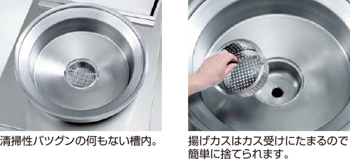 槽内には部品類が一切ないため、清掃性は抜群。さらに槽底部にカス受けを設けたため、底に溜まった揚げ力スなども簡単に捨てられます。調理終了後の清掃作業も大幅に短縮でき、人件費の削減につながります。