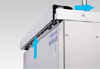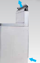 油槽全体を断熱材で覆い、さらに周囲に空気断熱層を設けました。これにより最適化された機器内部の気流が本体の熱を奪い、機器からの輻射熱、表面温度上昇を抑えます。また、調理中に手の触れやすい前カマチには取り外し可能なヒートプロテクターを装備。輻射熱を抑えるだけでなく接触時の安全性を高めています。さらに燃焼排気が拡散しない煙突構造を採用し、排気は速やかにフードへ導かれるため厨房内の環境も改善されます。