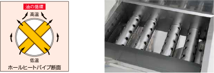 大型ホールヒートパイプによる特殊循環加熱方式により、高い熱効率を実現しました。しかも調理に使用する油槽の上部のみを加熱するのでエネルギーにムダがなく、省エネに効果的です。加えて油温の上昇も早くなり、ピーク時などにもスピーディなサービスが可能です。