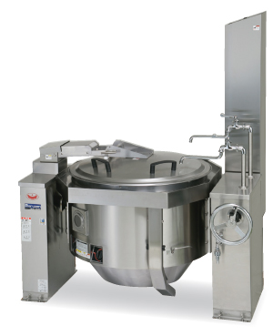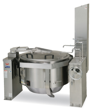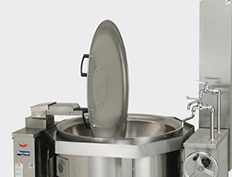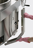ステンレス製中折れ式フタを採用。手が届きにくいフタ上部もラクに清掃が行えます。洗浄水のほとんどが釜内に落ちるため、床を濡らさず衛生的です。 |