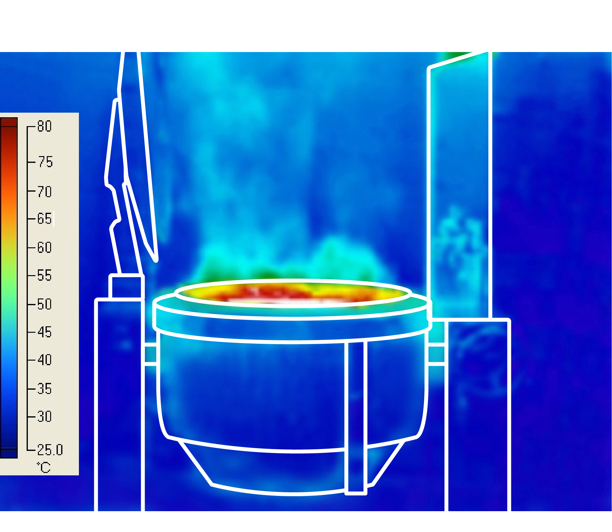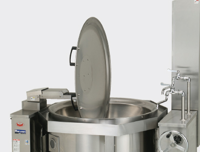 【中折れ式フタ】 ステンレス製中折れ式フタを採用。手が届きにくいフタ上部もラクに清掃が行えます。洗浄水のほとんどが釜内に落ちるため、床を濡らさず衛生的です。 |