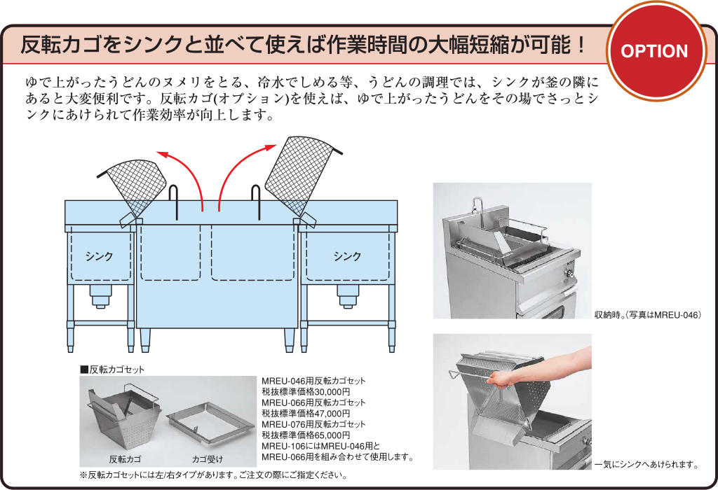 ●網カゴ外形寸法(mm):MREU-046用 W340×D350×H225 / MREU-066用 W490×D350×H225 / MREU-076用 W640×D350×H225