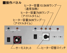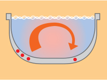 手前側に多く配置された鋳込みヒーターが釜底前方を集中加熱し、前方から後方への強い対流が発生。これにより麺を勢い良く回転させ、美味しくゆで上げます。