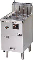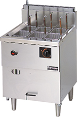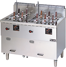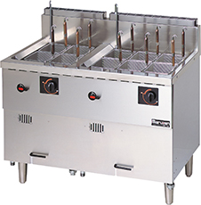 - 生めん用の丸カゴ、丸カゴ受けを予めセットしたタイプです。冷凍麺釜の機能はそのままに、生めんをおいしく、しかもスピーディにゆで上げます。