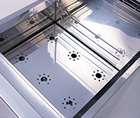 沸騰強化板に開けられた大きさの異なる穴から、湯の中でめんを効果的に踊らせるように大小の泡が効率的に発生し、冷凍めんを素早くほぐします。