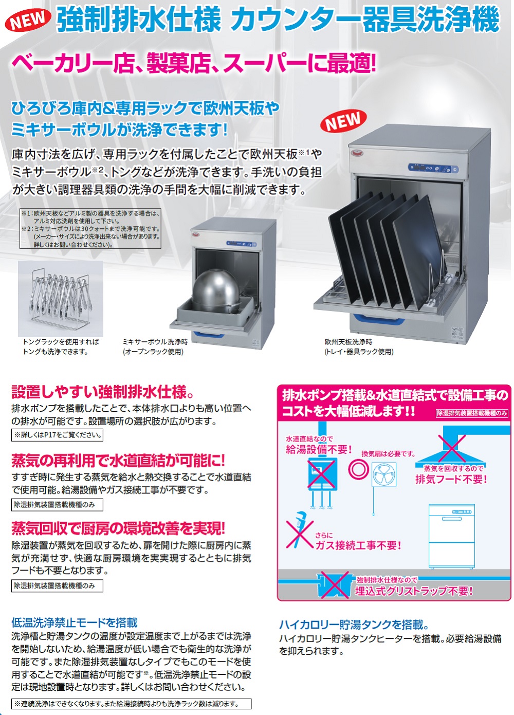 ⇒強制排水仕様カウンター器具洗浄機 仕様・価格