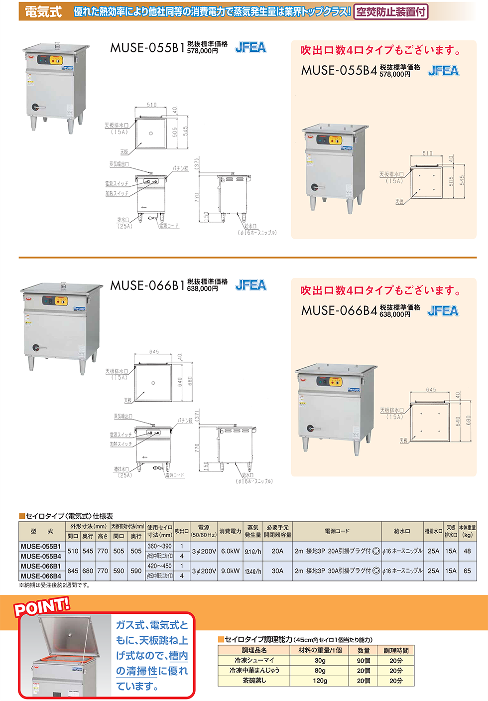 - 小型高性能強力ボイラー採用で立ち上がりが早く、スピーディに蒸しあげます。