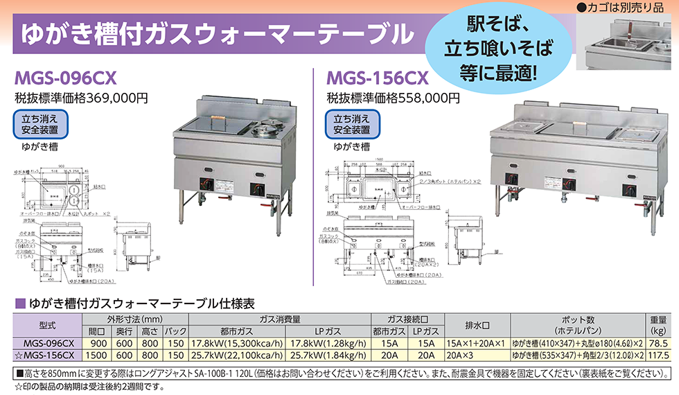 ゆがき槽とウォーマーテーブルが一体化!駅そばなど大量販売に最適。