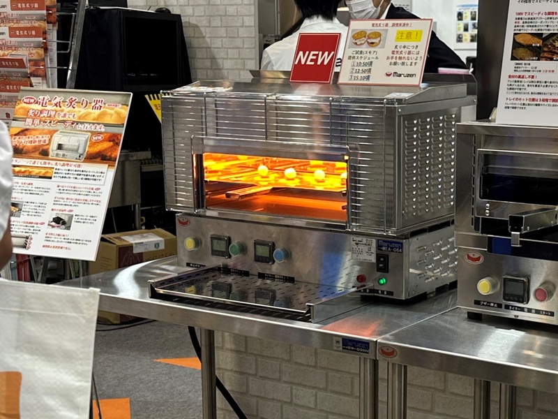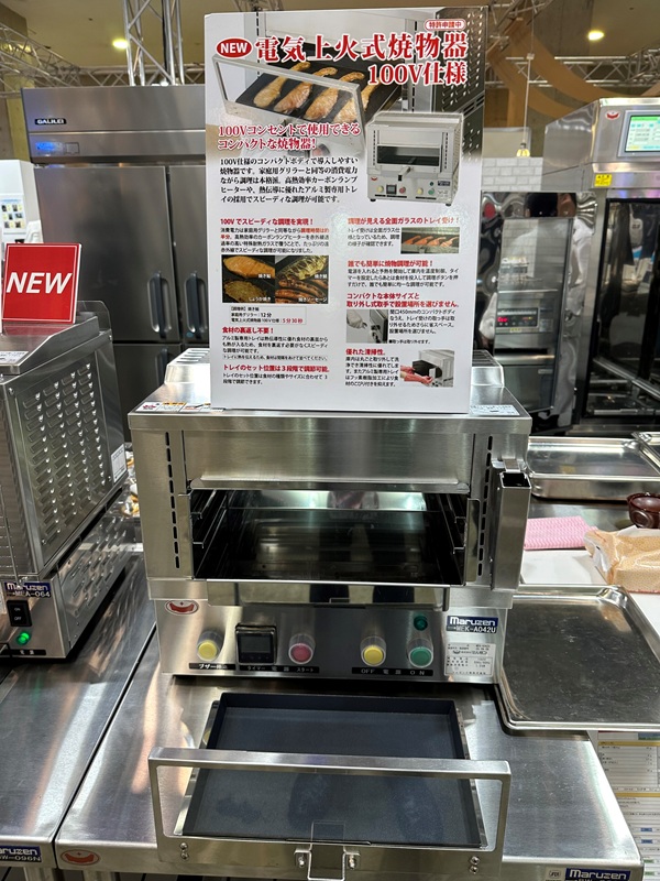 9月新発売の「電気上火式焼物器(100V仕様)」を展示。こちらは、家庭用グリラーよりも短時間かつ同等の消費電力で調理が可能です。