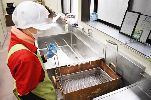 「こちらは芋けんぴの調理に使っています。オートリフトタイプなので自動で揚げ上がるのが良い。それに芋けんぴをタレに漬ける工程があるのですが、効率よく行えるようにフライカゴの取っ手を長くオーダーメイドしてもらいました」
