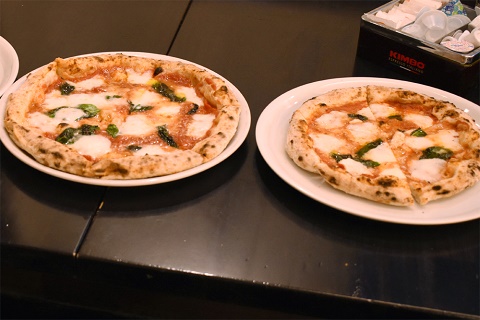 ご覧のとおり、お店で出てくる焼き立てのピッツァと何の遜色も無い。香ばしい香りに湯気が立ち上る熱々のチーズ、どう見ても焼き立てのピッツァである。さらに坂本シェフいわく「グランツァの生地は国産の全粒粉を48時間かけて低温長時間発酵させてます。生地の味も楽しめるピッツァです」とのことで、食べてみるととにかく生地が美味しい。香りと味はもちろん、もちもちした食感が食べ応え抜群だ。さらにこの日は坂本シェフみずから"カリノ"を使って通常の焼き立てピッツァとの比較もしてくれたが、さきほどの通販用ピッツァと並べてみてもまるで違いは感じられない。改めて遜色の無さがよくわかる。
