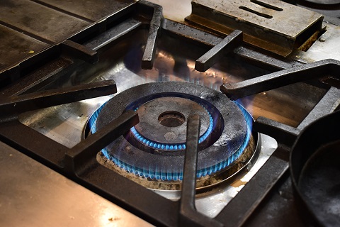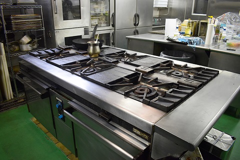 それでは厨房にお邪魔させていただく。まずはメインダイニングの厨房だ。ひと際存在感を放つのは厨房の中央に位置する両面式の大きなガスレンジ。2019年より当社が事業譲渡を受けた旧オザキ製のガスレンジだ。