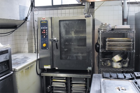 そしてそのガスレンジの奥に位置するのが当社製スチームコンベクションオーブン〈スーパースチーム〉。こちらは10段タイプだ。