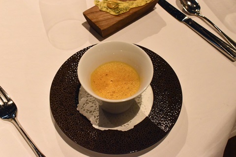 明石浦漁港で上がった"未利用魚"を使ったスープ。豊かな魚介の香りと驚くほど濃厚な味が強烈な印象を残す。しかしこれだけ濃厚な味でありながら、前田シェフの言葉どおり一切の臭みがなく凝縮された魚の旨味だけを純粋に味わうことができる。前田シェフの水産資源問題への取り組みを表す象徴的なメニュー。