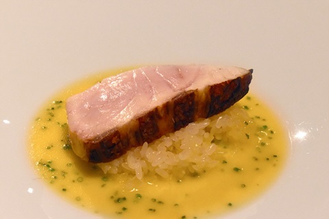 ほんのりと赤みの残るハマダイの絶妙な火の通り加減には驚くばかり。シブレットで緑に彩られたソースは濃厚のひと言。しっとり柔らかいハマダイと硬めのリゾット、そして濃厚なソースそれぞれの食感のコントラストが心地よい。