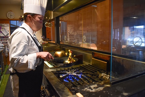 「例えばハンバーグでしたら通常はチャーブロイラーで焼き目を付けた後の火入れはガスレンジのオーブンを使うのですが、修学旅行など団体のお客様がいらっしゃったときは一度に数十枚のハンバーグを調理しなければならないためスチコンを使います」