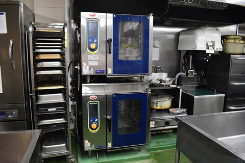 さらに厨房の奥には当社製のスチームコンベクションオーブン〈スーパースチーム〉が。こちらは二段組で設置されており、普段は野菜・根菜類のロースト等が主な用途だそうだが、団体客対応時にはハンバーグの調理にも使うと信夫料理長は言う。
