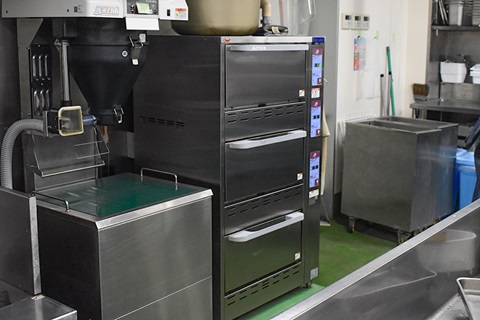 他にもガス式の立体自動炊飯器も導入。やはり大量の炊飯調理には欠かせない。スープレンジは普段はステーキの付け合わせのスープ調理等が主だが、団体客対応時にはカレー調理にも威力を発揮するとのこと。