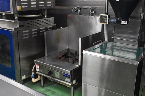 それではいよいよ〈レストランKANTO〉の厨房へ。同店は白老エリアで長年求められてきた初の「団体旅行に対応できる大型飲食店」であり、大量調理にも対応できる仕様となっている。まずは同店名物の白老牛のステーキを調理するチャーブロイラー。蓄熱性と遠赤外線効果に優れる溶岩石によってジューシーな仕上がりを実現するとともに、ステーキに欠かせない美味しそうな焼き目付けが可能となる。〈レストランKANTO〉料理長の信夫氏からも「ステーキに綺麗な焼き目をつけられる」とコメントをいただいた。