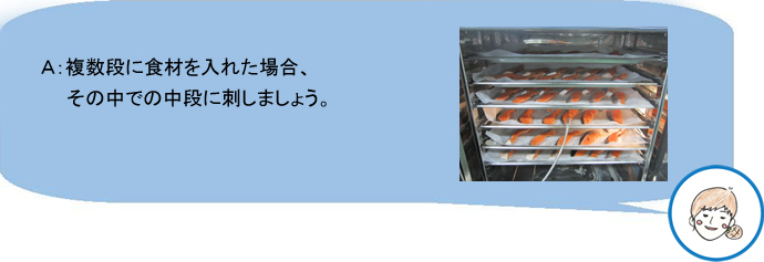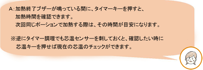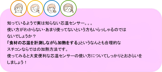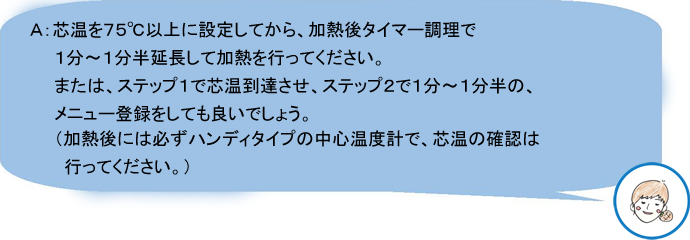 Q:食材のどこに刺したら良いの? Q:ホテルパンの何段目に刺したら良いの? Q:芯温調理だと実際に加熱にかかった時間が見られないのでは? Q:「大量調理施設衛生管理マニュアル」では、芯温75℃1分間以上、 ノロウイルスのおそれのある場合は、85〜90℃90秒間以上だが、 芯温到達した時点で加熱終了で良いの?