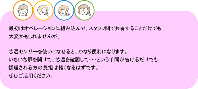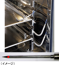 ・大量調理マニュアルの、「中心温度3点以上の計測」 を加熱中に行うことができる。