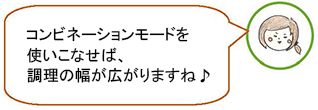 ・コンビネーションモード:「蒸気」と「熱風」を組合せて庫内へ送り込み、 循環させて加熱します ・・・煮る・炊く・炒める